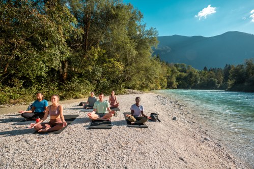 Diverse people sitting on yoga mats, practicing yoga on a riverbank and enjoying peace in a tranquil outdoor session.